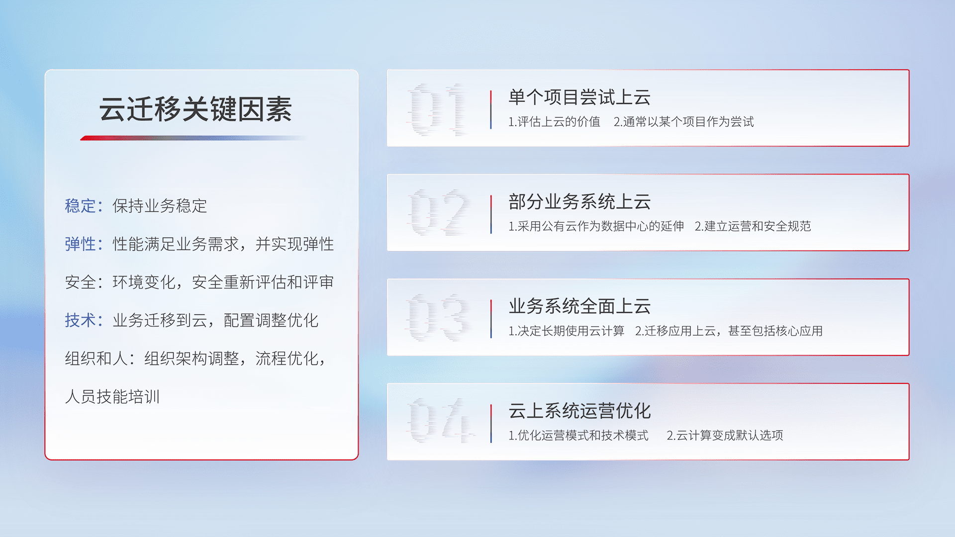 结合实际业务,,,,从规划设计、、、云平台选型、、、云原生改造、、数据迁移、、集成交付,,迁移全过程为客户识别最佳上云路径,,做好风险识别管理,,,,设计网络架构、、、、身份权限、、安全审计合规、、、、操作审计、、、、日志审计、、、监控告警策略、、多站点容灾设计等,,,,对云上基础设施进行整体规划,,提升IT治理水平,,以满足弹性、、、、高可用、、高性能的需求。。。。
