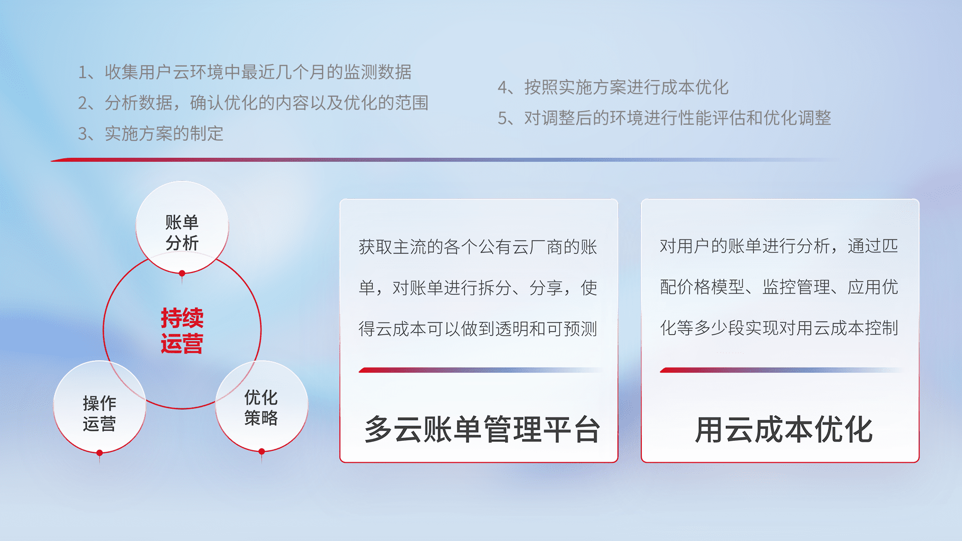 通过多云纳管,,,以统一的资源数据模型把客户的云资源进行抽象和封装,,进而实现对多云资源的统一操作,,,保障云资源管理的可靠性、、、、稳定性与可用性。。。。量身定制化运维内容,,,配置、、开发运维、、、补丁管理、、、、备份、、、监控、、、认证和访问管理、、审计和日常巡检等,,保障在用云过程中的可靠度,,,,稳定度以及高可用率。。。。